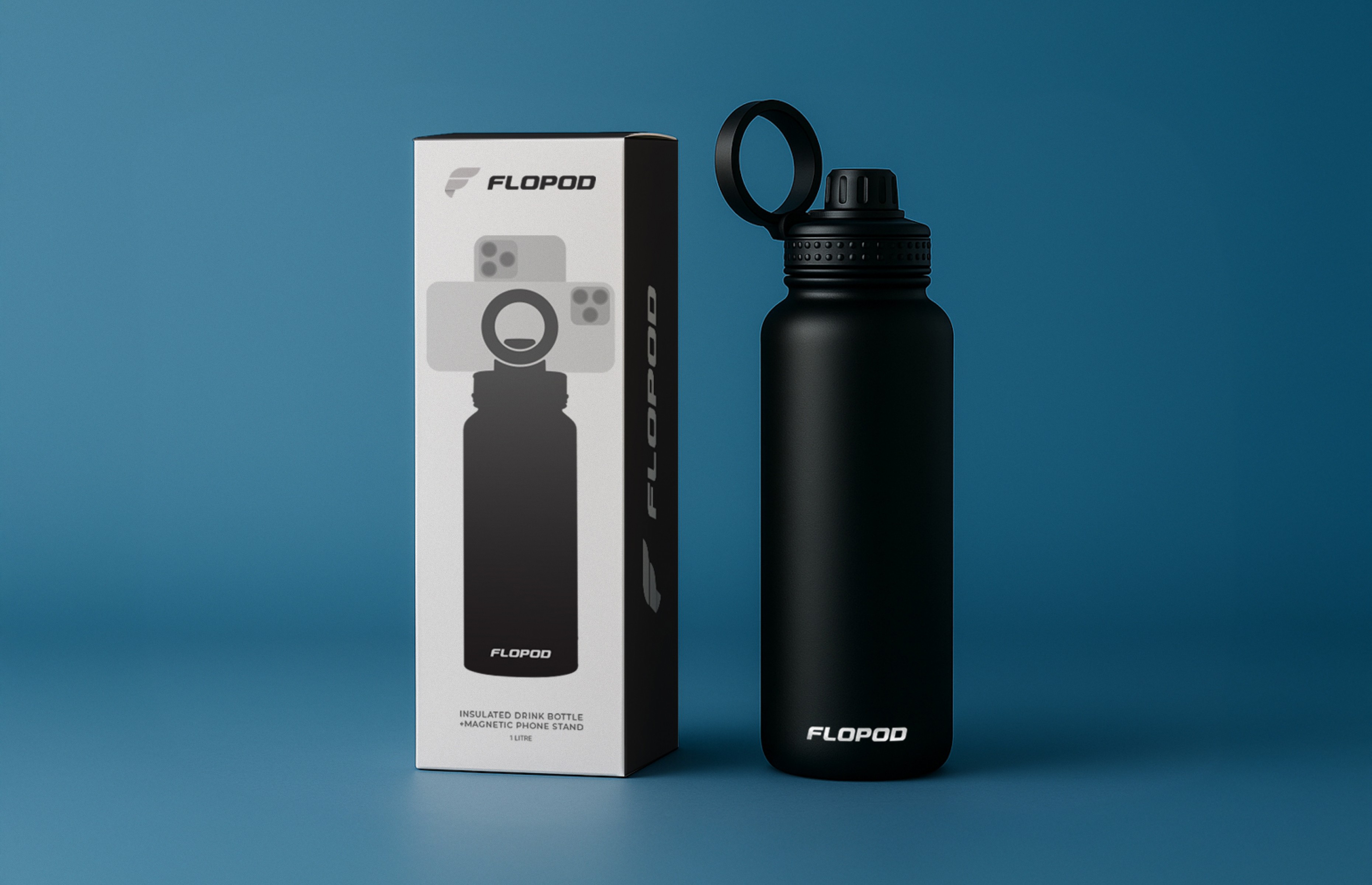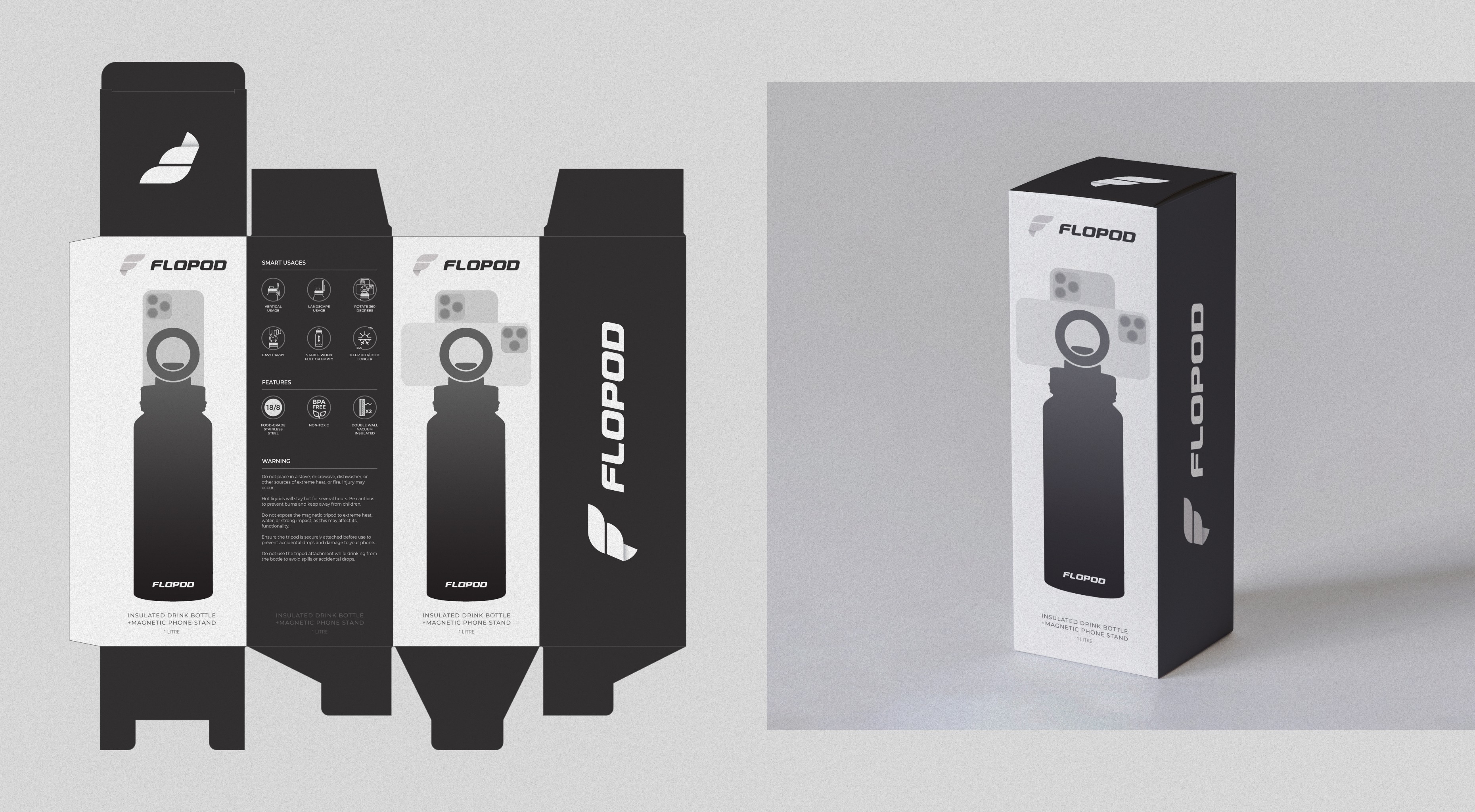FLOPOD is an innovative lifestyle product that blends hydration with functionality—a water bottle that doubles as a magnetic tripod for content creation, calls, and convenience. I was brought on by founder Maikil Georgy to develop the brand identity and packaging design for this upcoming launch. The name merges “flow” (inspired by water) and “tripod,” capturing the dual-purpose nature of the product. The brand needed to feel fresh, dynamic, and universally appealing targeting everyone from gym-goers and creators to students and parents.